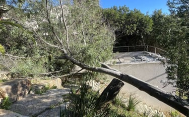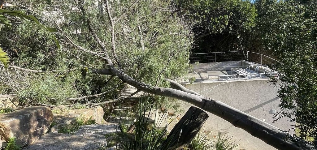 Élagage d’un mimosa tombé à cause des fortes pluies et du vent, ayant endommagé une rambarde.