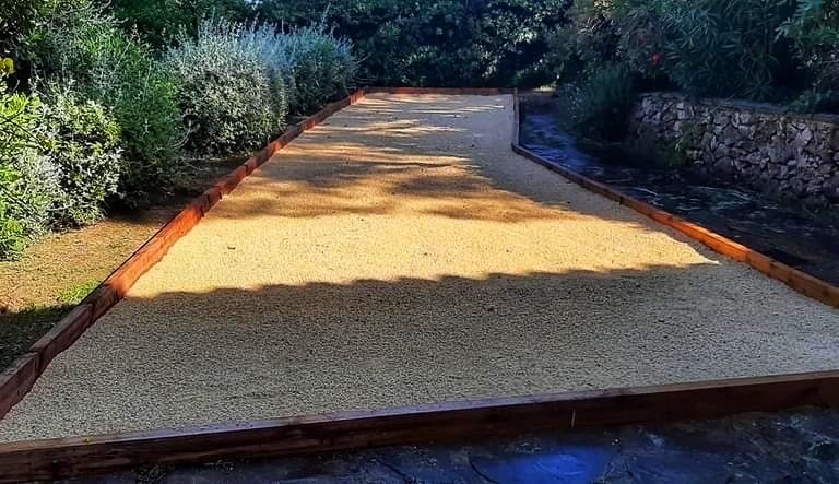 Création complète d’un terrain de boules avec préparation du sol, mise à niveau et finitions soignées, garantissant durabilité et confort de jeu.