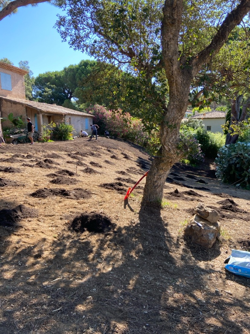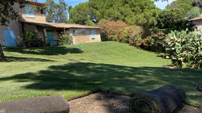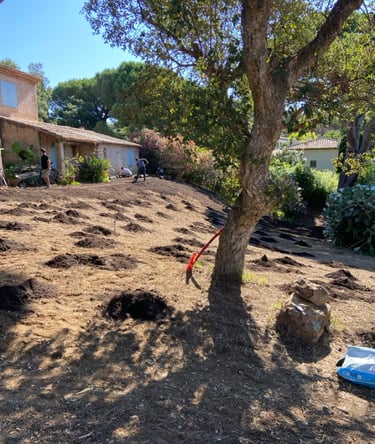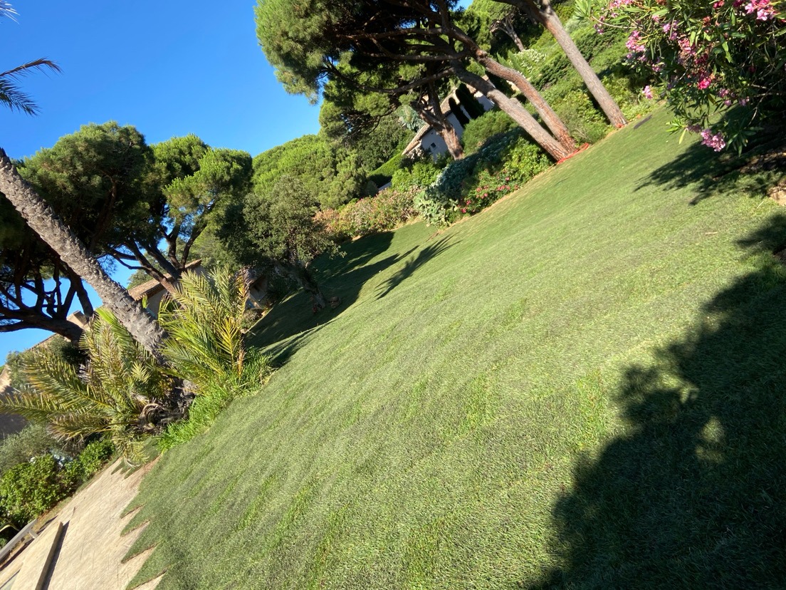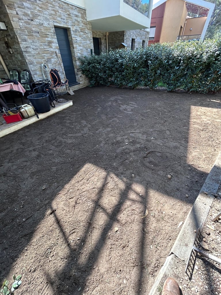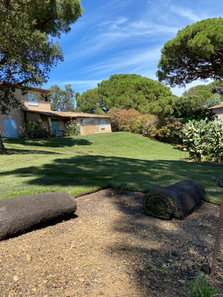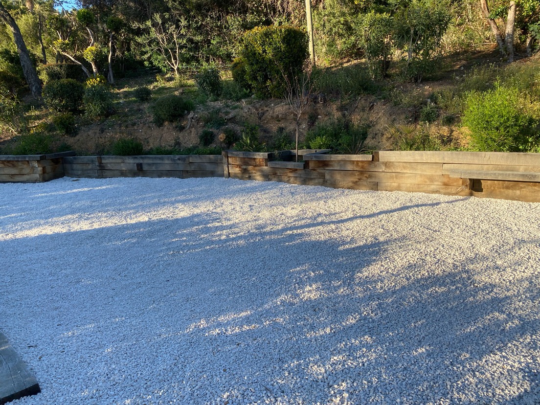 Le chantier a été réalisé avec soin : préparation du terrain, pose du gazon, installation des restanques et mise en place d’un système d’arrosage automatique pour créer un espace harmonieux, durable et facile à entretenir.