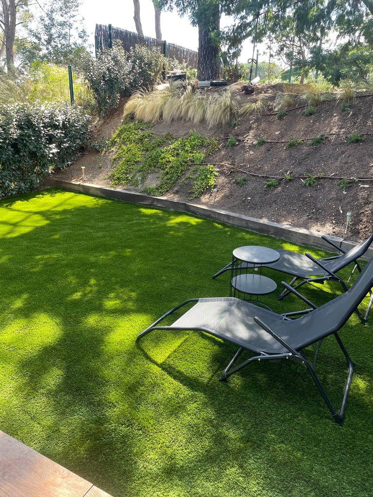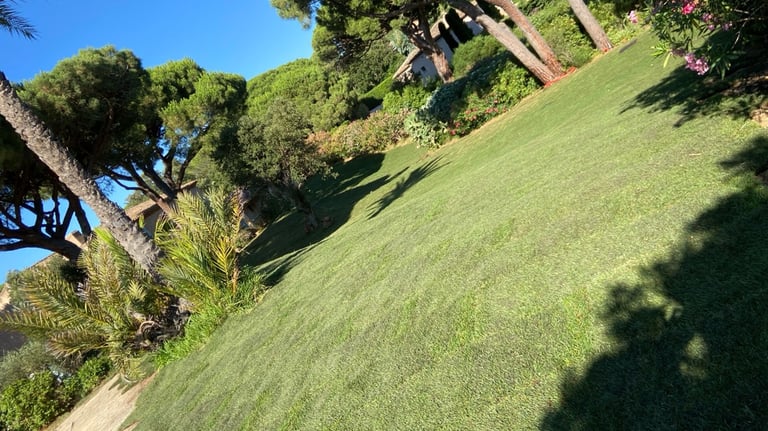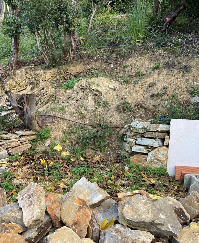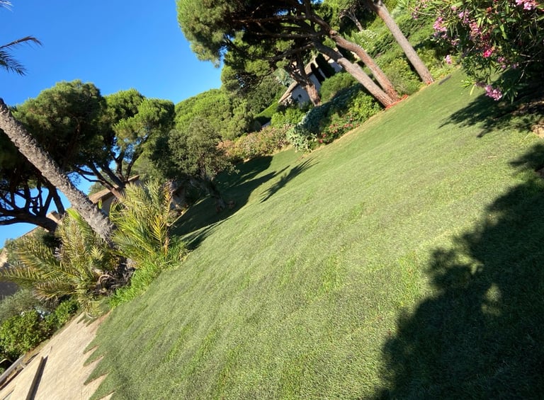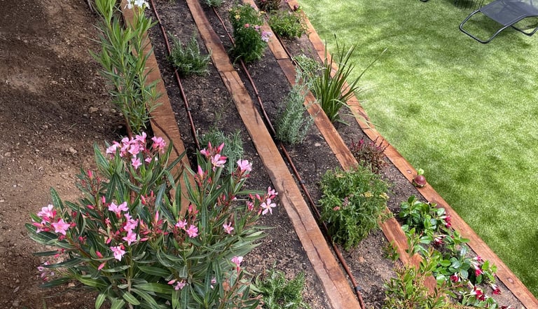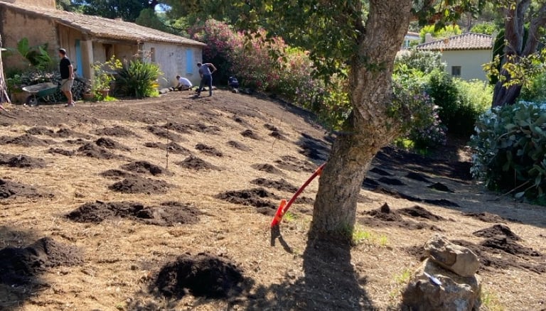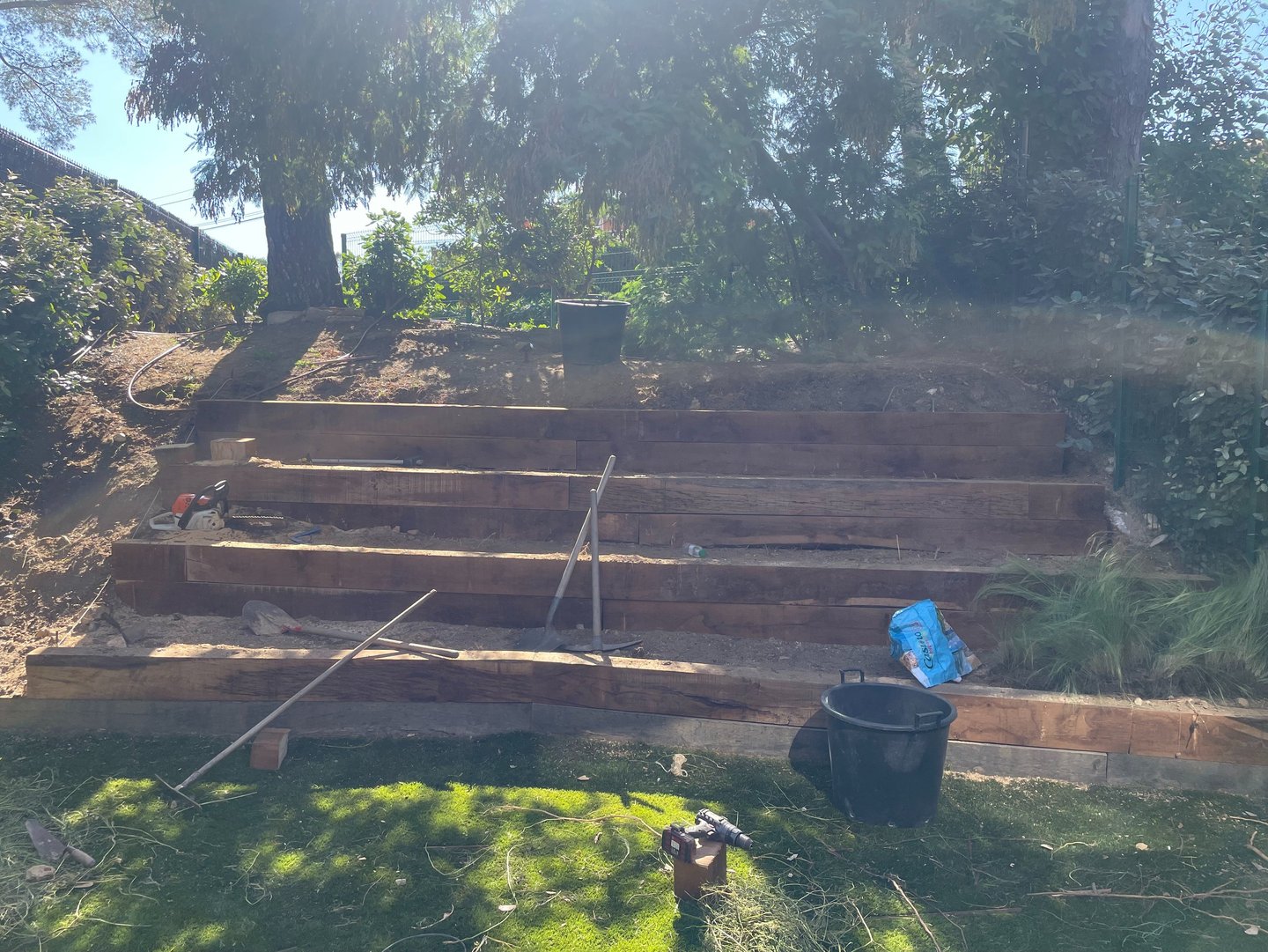 Le chantier a été réalisé avec soin : préparation du terrain, pose du gazon, installation des restanques et mise en place d’un système d’arrosage automatique pour créer un espace harmonieux, durable et facile à entretenir.