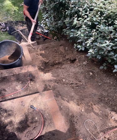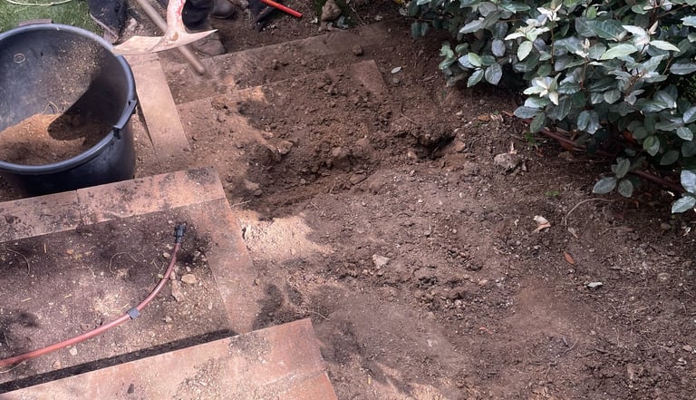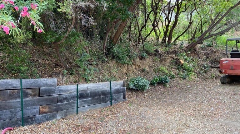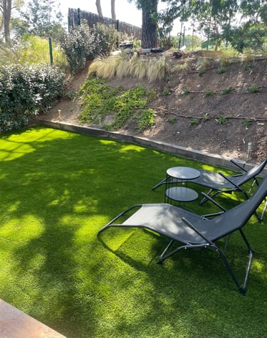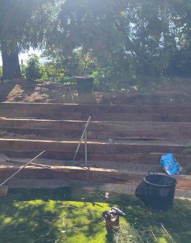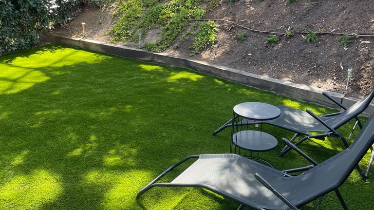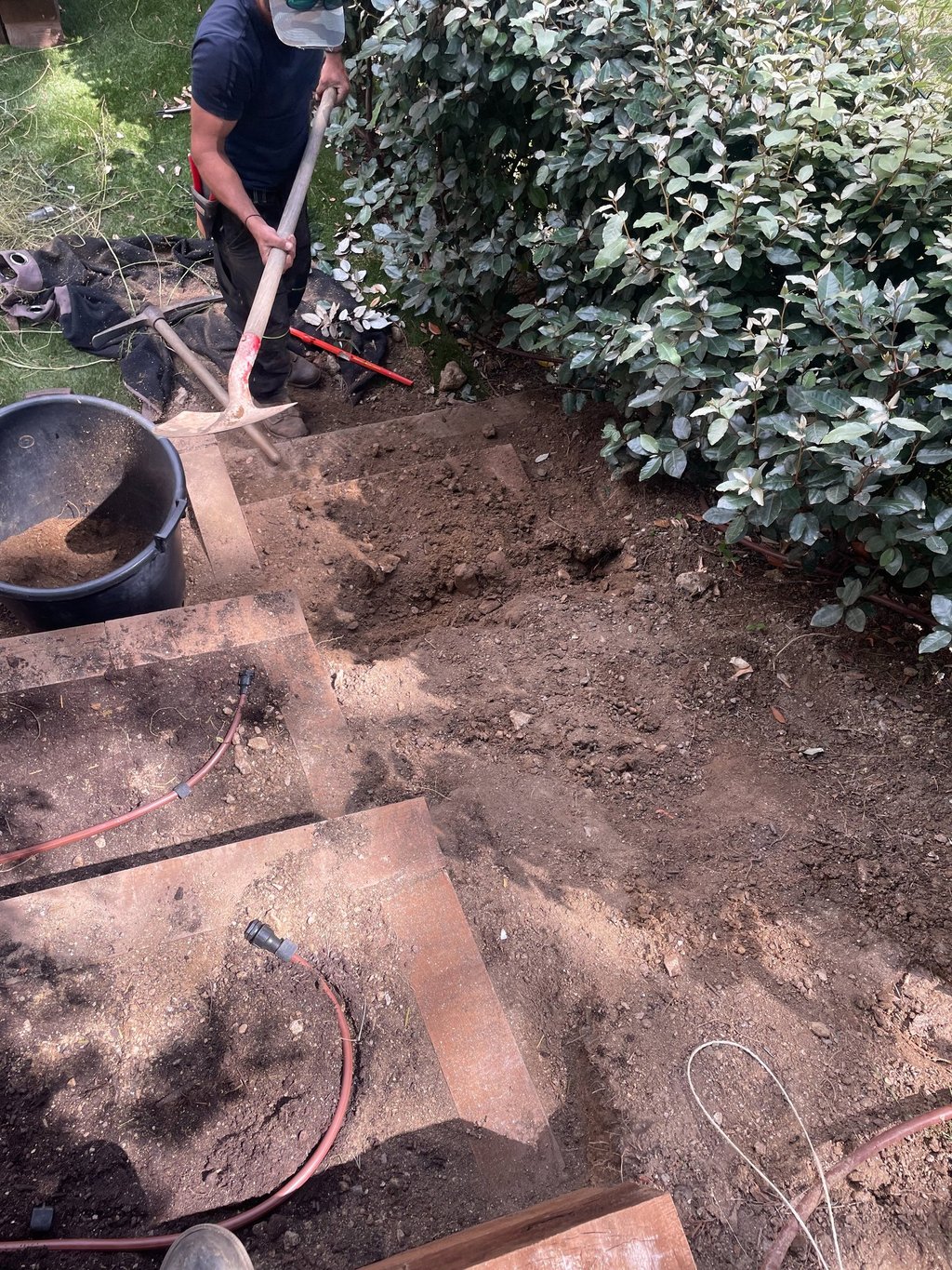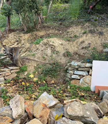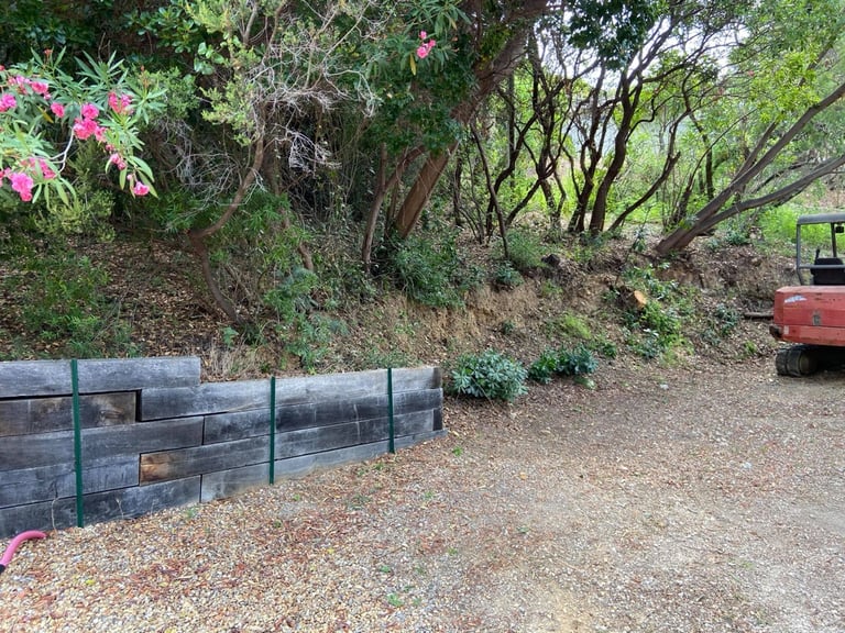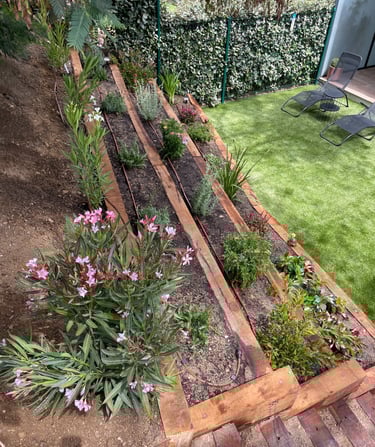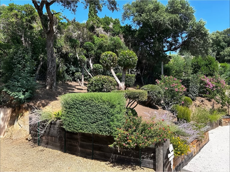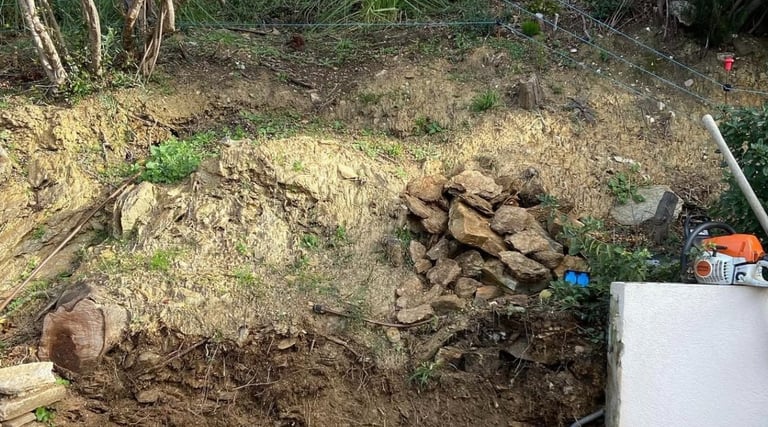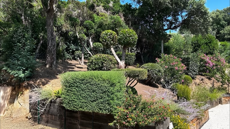 Le chantier a été réalisé avec soin : préparation du terrain, pose du gazon, installation des restanques et mise en place d’un système d’arrosage automatique pour créer un espace harmonieux, durable et facile à entretenir.