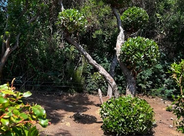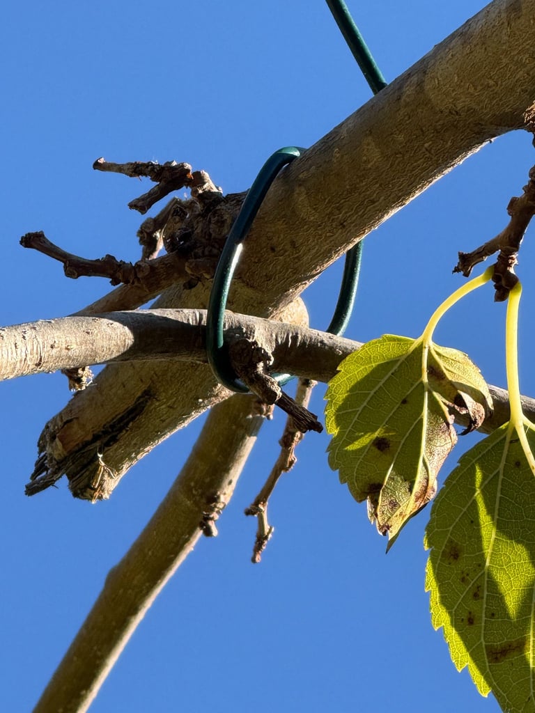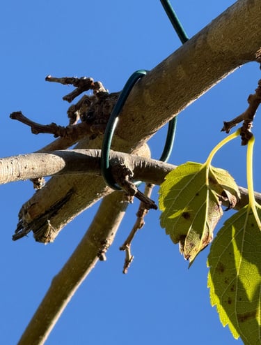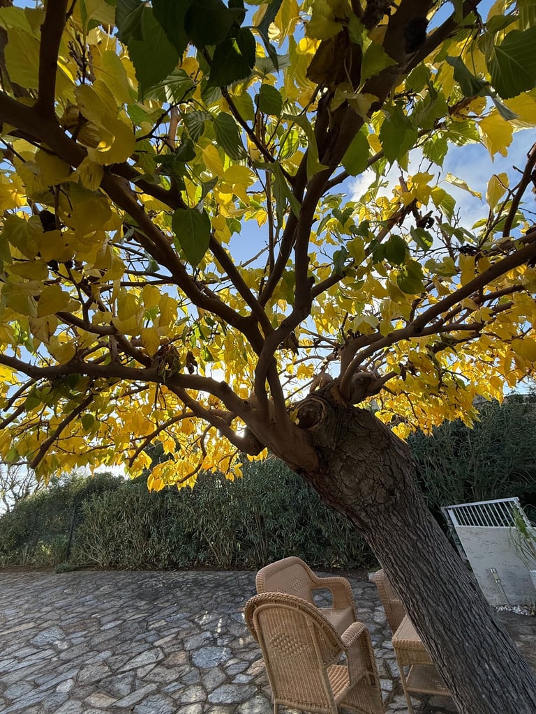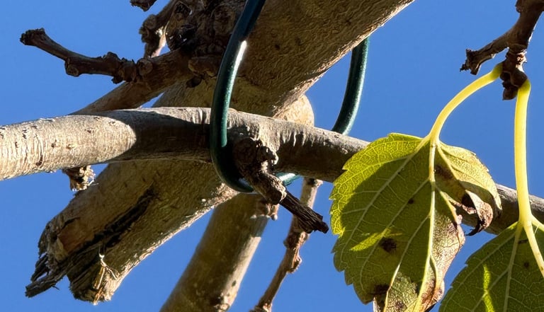 Aménagement de parasols naturels grâce à des mûriers soigneusement attachés pendant plusieurs mois pour leur donner la forme souhaitée.