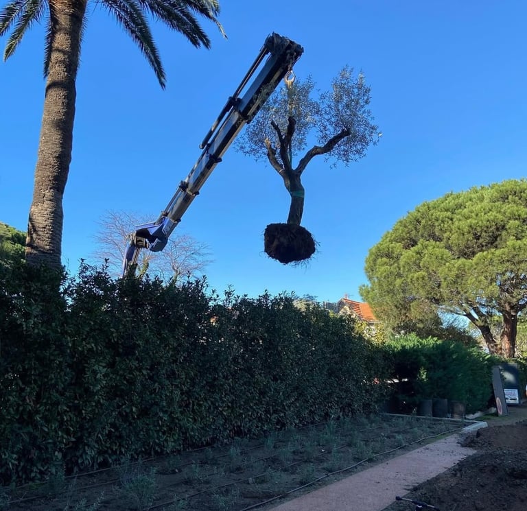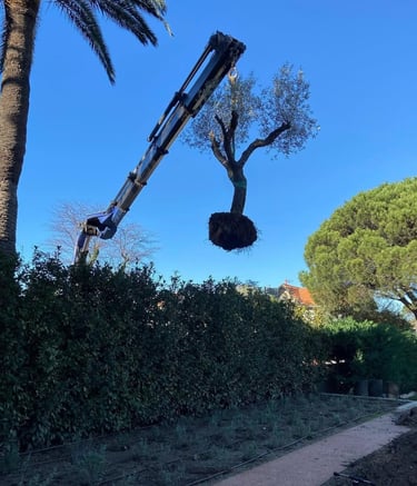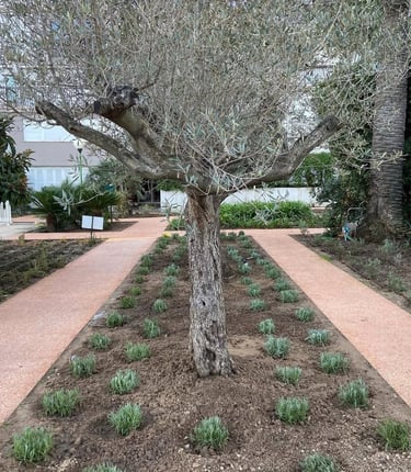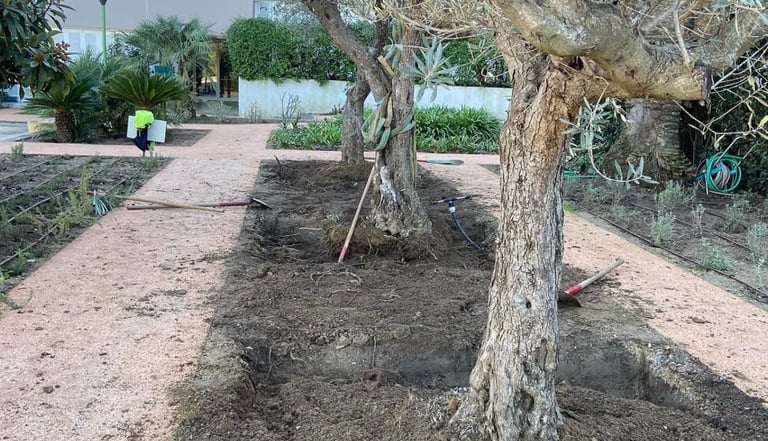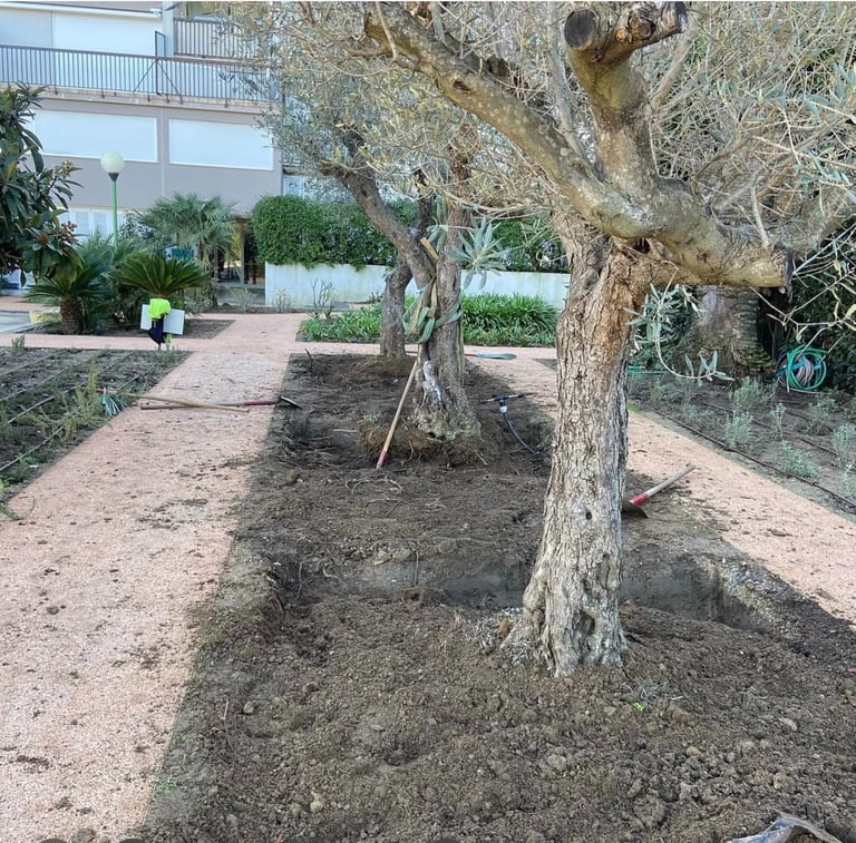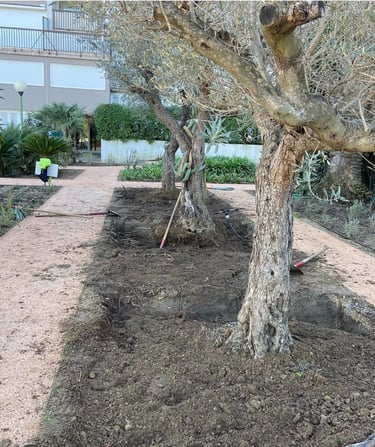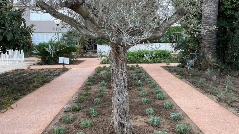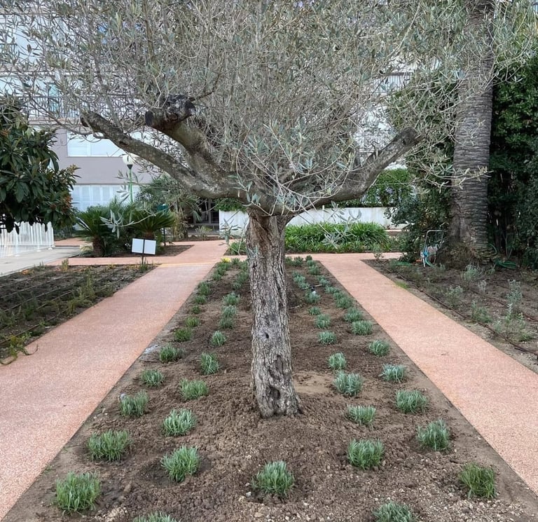 Création d’un massif méditerranéen avec la plantation de 3 oliviers et de romarin.