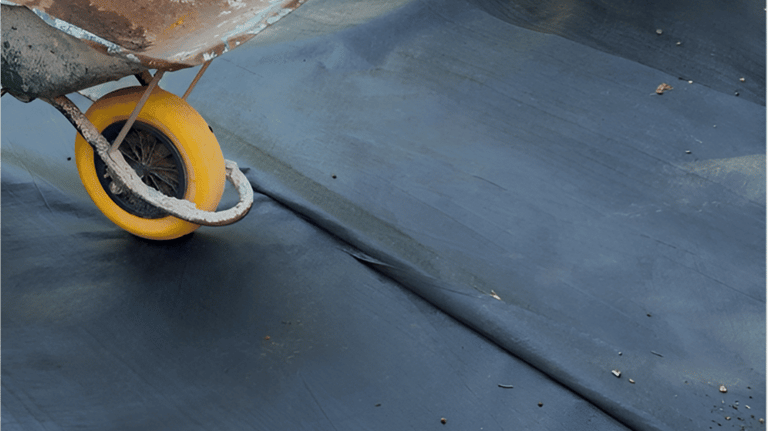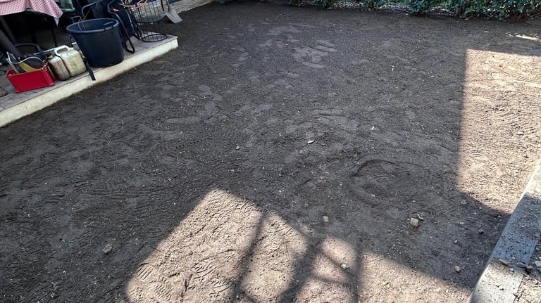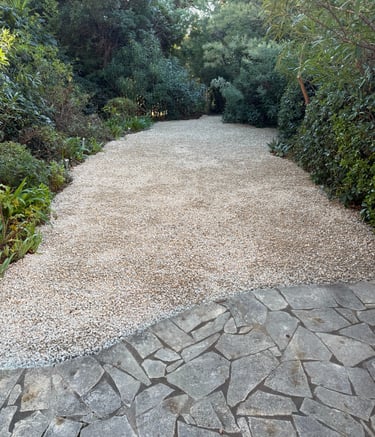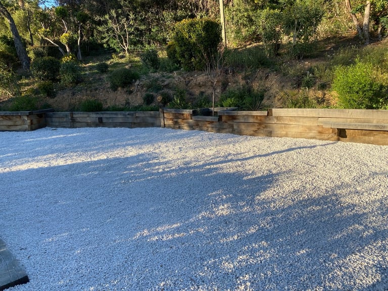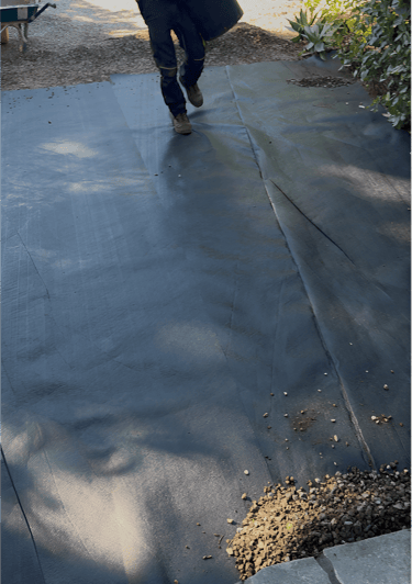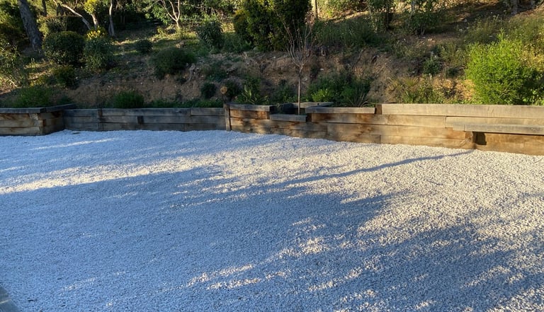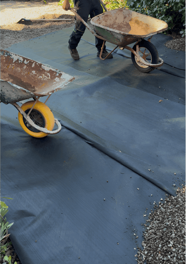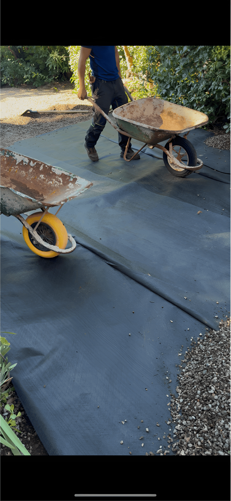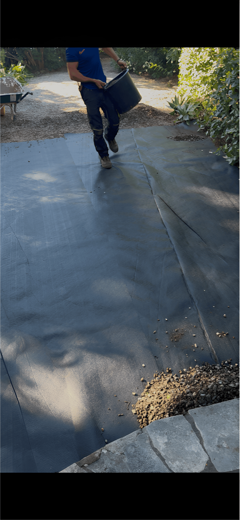 Sol préparé avec un géotextile anti-mauvaises herbes et recouvert de gravier, pour un extérieur soigné, facile à entretenir et agréable à vivre.