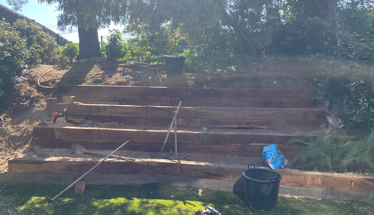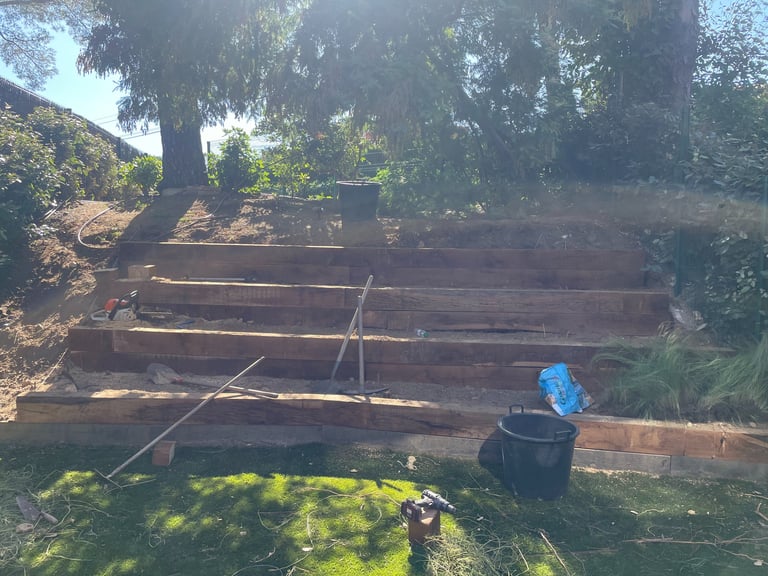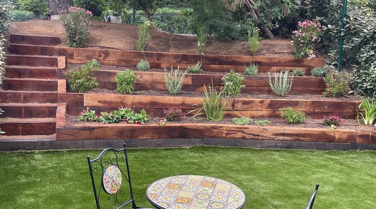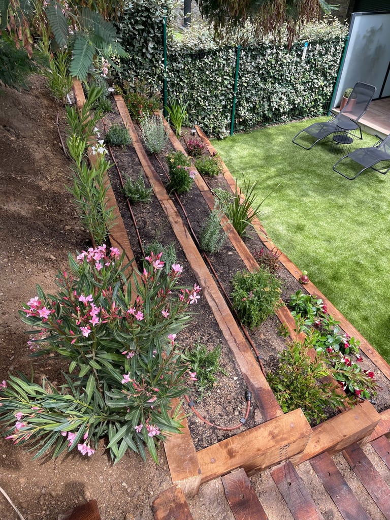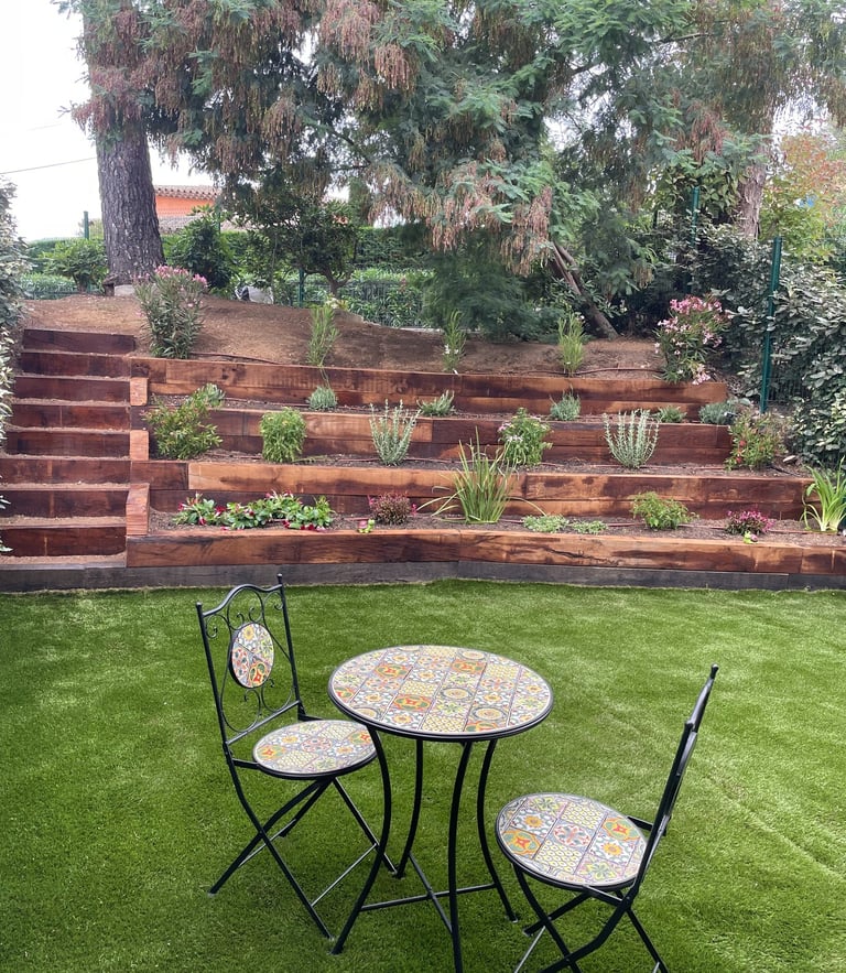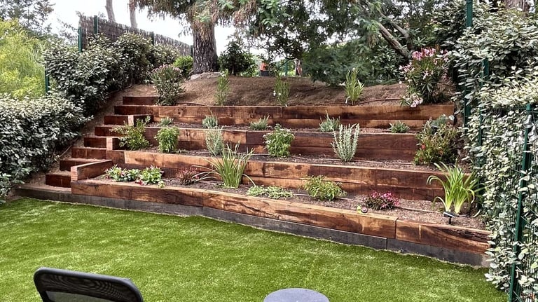 Aménagement complet d’un jardin avec gazon synthétique de qualité, intégrant 3 restanques en traverses de chêne et plantations variées.
