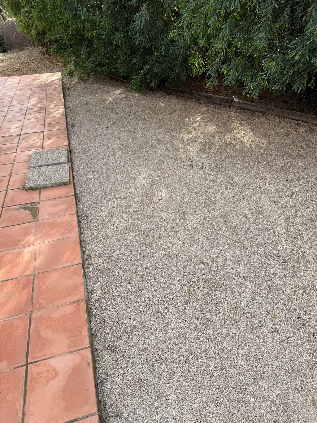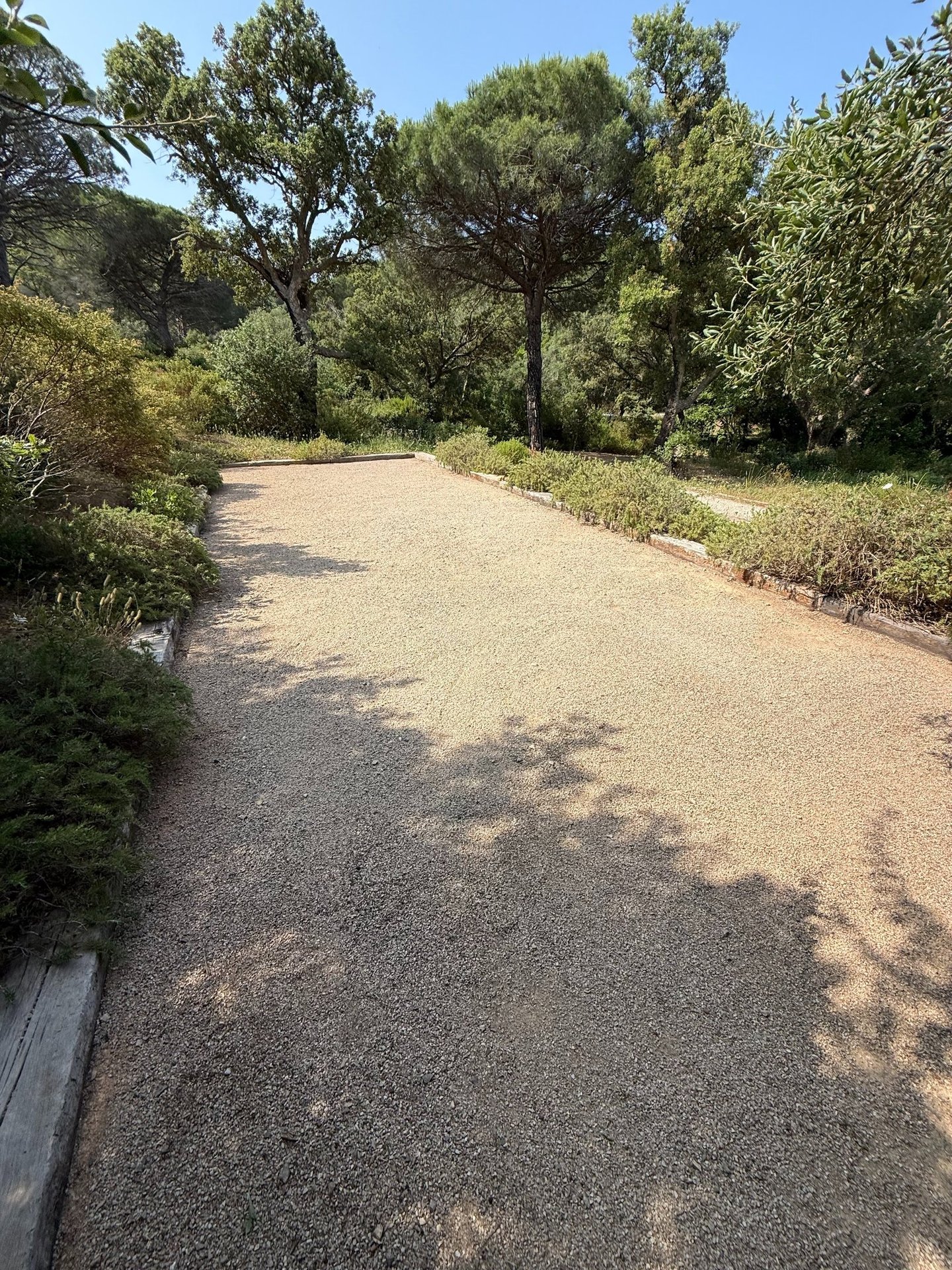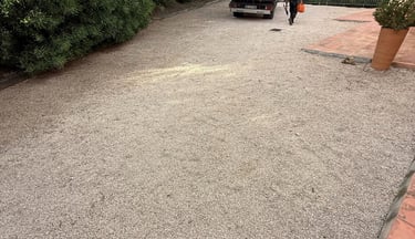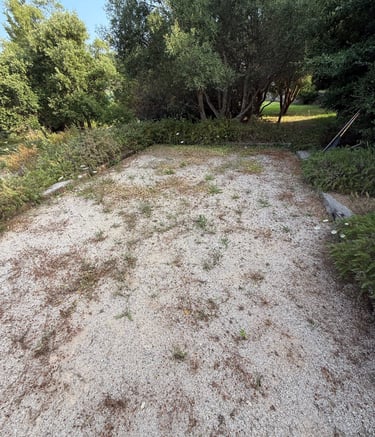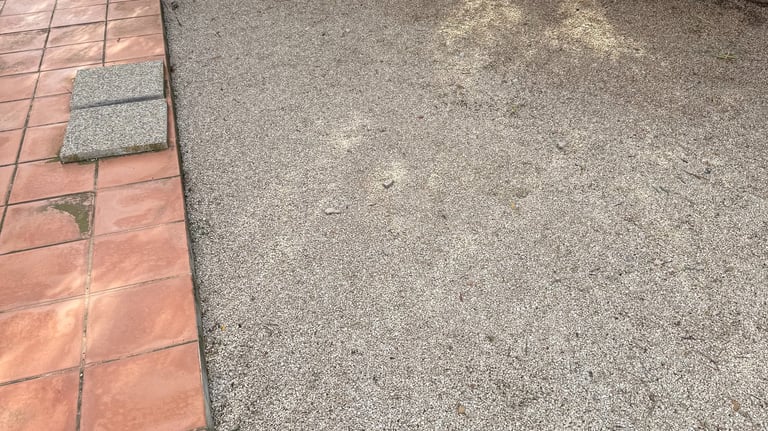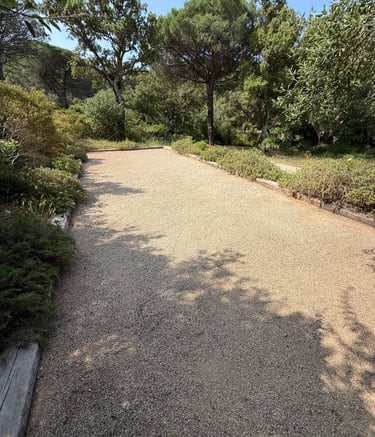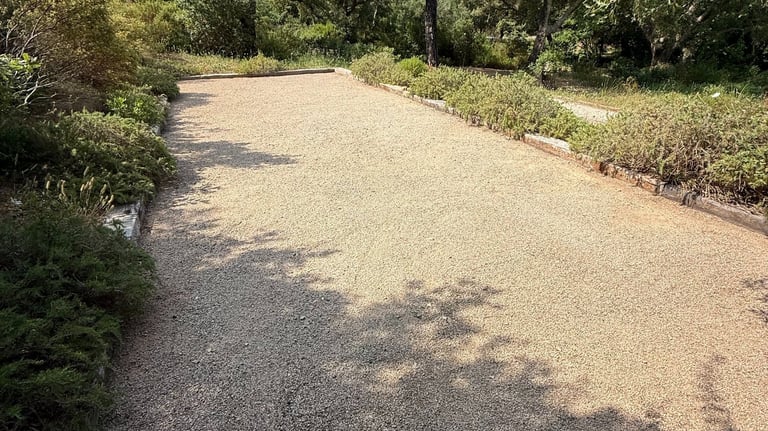 Entretien manuel des terrains de boules et espaces en gravier, avec grattage des mauvaises herbes à l’aide d’outils manuels.