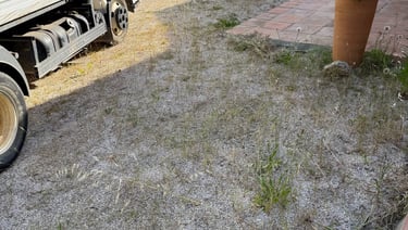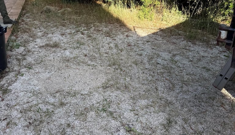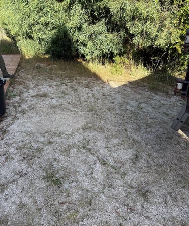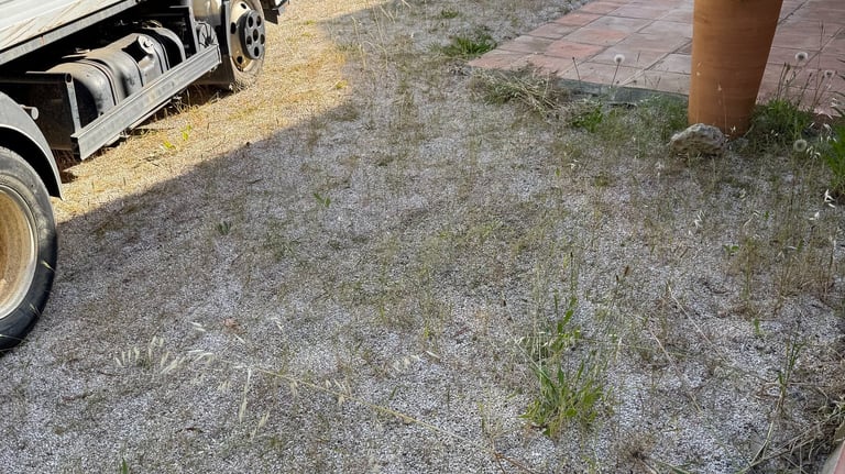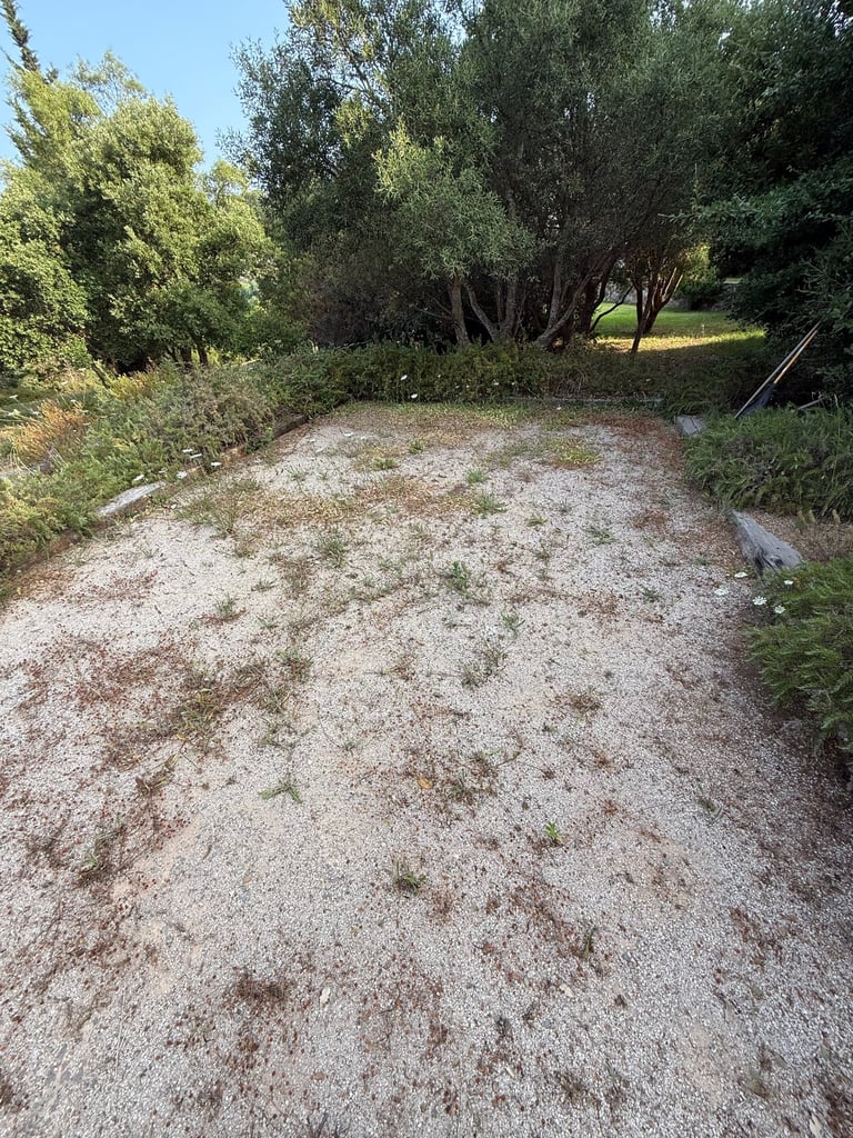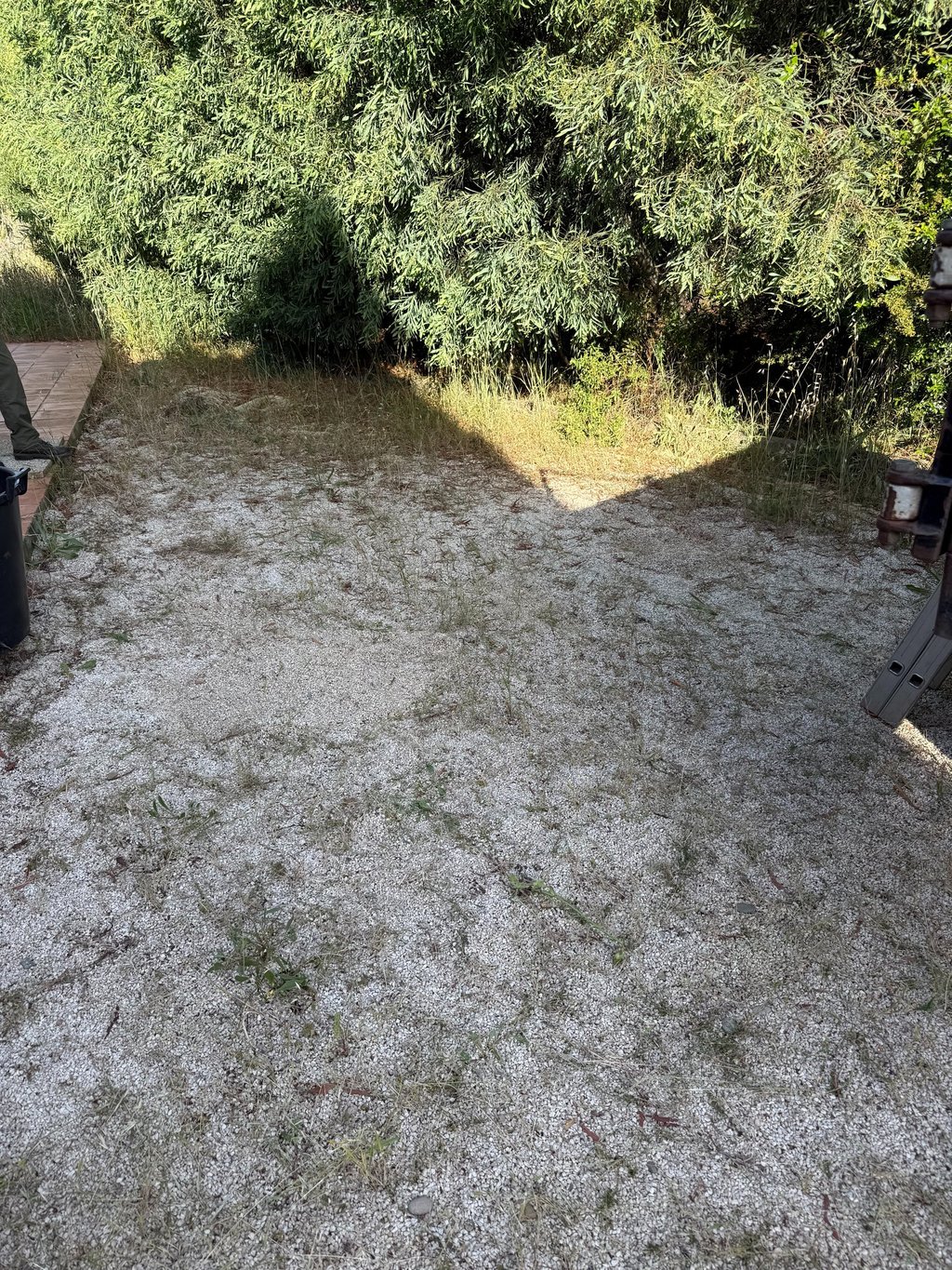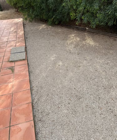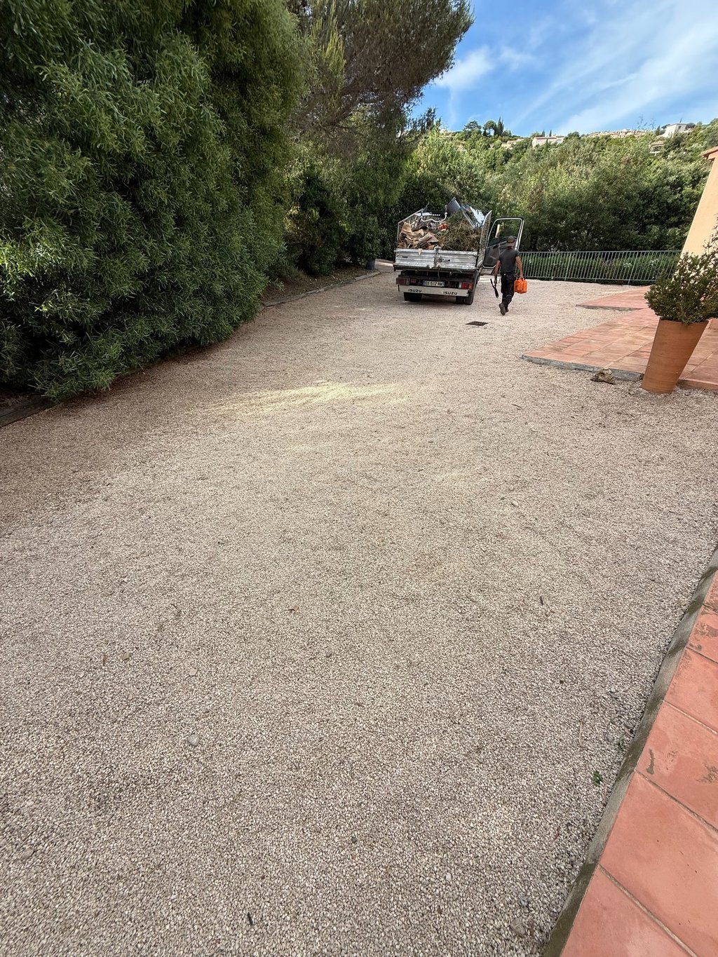 Entretien manuel des terrains de boules et espaces en gravier, avec grattage des mauvaises herbes à l’aide d’outils manuels.