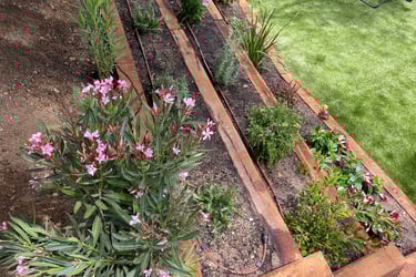 Aménagement complet d’un jardin avec gazon synthétique de qualité, intégrant 3 restanques en traverses de chêne et plantations variées. Le chantier a été réalisé avec soin : préparation du terrain, pose du gazon, installation des restanques et mise en place d’un système d’arrosage automatique pour créer un espace harmonieux, durable et facile à entretenir.